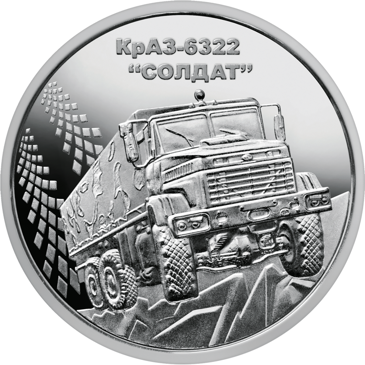 На реверсі монети зображено автомобіль КрАЗ-6322 “Солдат”, який рухається вгору, залишаючи слід шин; угорі напис КРАЗ-6322/“СОЛДАТ”.